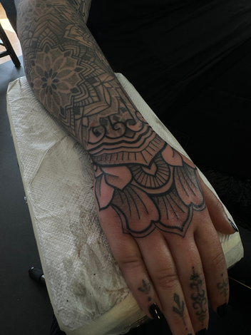 Meine Schwerpunkte liegen in Blackwork/out, Dotwork, Ornamentale und geometrischen Tattoos. Genau dort finde ich die Balance zwischen Mathematik und Emotion, zwischen Struktur und Ausdruck. Hin und wieder entstehen auch illustrative Motive – immer reduziert, kraftvoll und treu meinem Stil. Was du bei mir allerdings nicht findest: farbige Tattoos. Nicht, weil sie weniger wert wären, sondern weil Schwarz für mich die ehrlichste Form von Ausdruck ist.